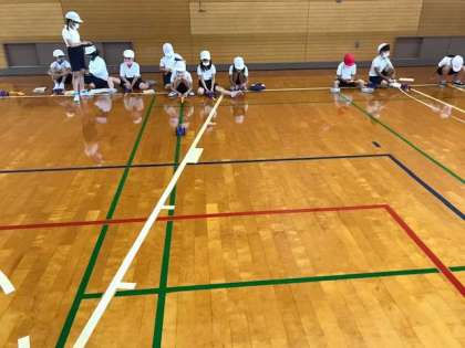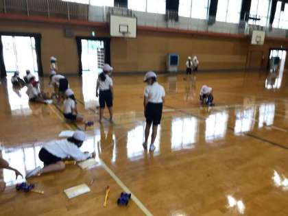 ゴムの力で車を走らせてみました。ゴムを伸ばす長さを変えて距離をはかり、その違いを見てゴムの特徴について考えました。