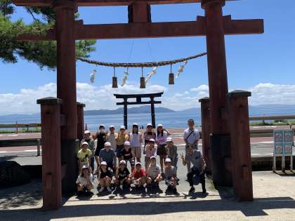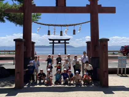 湖に浮かぶ鳥居を見て大興奮の子どもたちです。