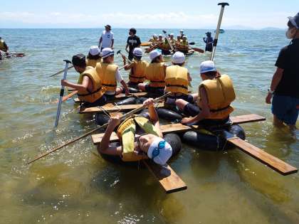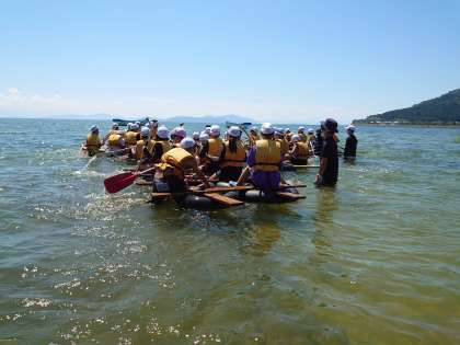 できたいかだを琵琶湖に浮かべて、こぐ練習をしました。