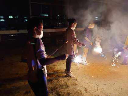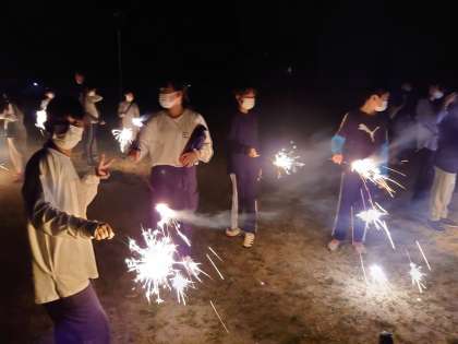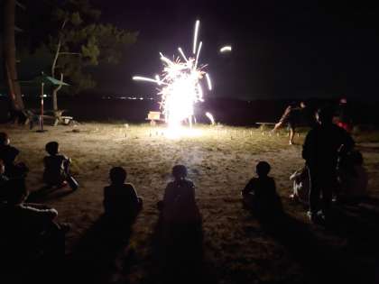ナイトハイクのあとは、宿舎の前の広場で花火をしました。手持ち花火を楽しんだあとは、吹き上げ花火を見ました。