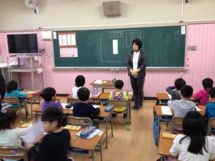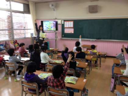 今日は教室でこくごとせいかつの学習をしました。こくごの「おや なにかな」の学習では、教科書の絵から見つけたものをたくさん発表しました。「羊がいます。」「ハチがいます。」「いろんな気球があります。」など、どんどん手を挙げて発表することができました。