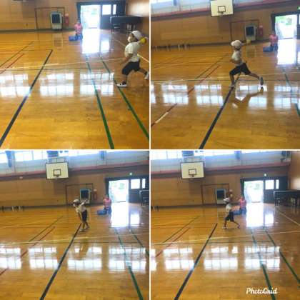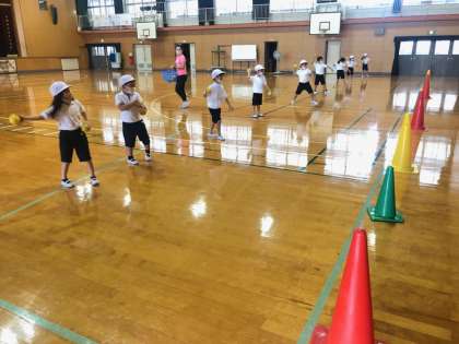体育で、ボール運動をしました。今日は、ソフトボールの大きさの柔らかいゴムボールでボールを投げる練習をしました。先生に投げ方を教えてもらい、力強くまっすぐに投げることができました。まと(コーン)にあてる練習をして、最後には、講堂の端から端に向かって思いっきり投げていました。来年のソフトボール投げもばっちりですね。