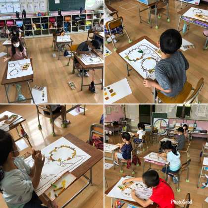 学習園で育てているひまわりをクレパスを使って、描いています。色を重ねて塗ることで、本物のような色合いで塗れています。「次はどんな色にしようかな?」と悩みながら挑戦しています。どの子もそれぞれ個性のあるひまわりで、完成がとても楽しみです。