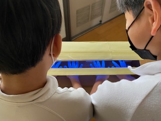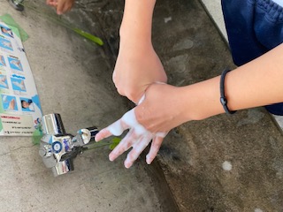 そのあとに、手洗い指導をしていただきました。手洗いのポイントを確認し、今日はブルーライトを使って、洗い残しがないか確認しました。ライトで照らすと、汚れが残っている部分が白く浮かび上がってきます。自分では洗ったつもりでも、なかなか汚れが落ちていないことが目で確認出来て、みんな手洗いに夢中になっていました。