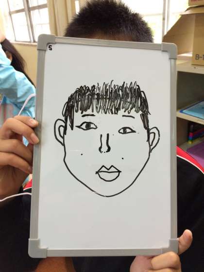 やり方は、班に一つのミニホワイトボードを用意し、1人一つずつの目や鼻などの顔のパーツを描いていきます。そして、顔が完成したら発表会です。