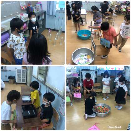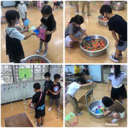 今日は、2年生が企画・準備を進めていた夏まつりに1年生がお客さんとして、参加しました。2年生は、「いらっしゃいませ〜。」ととても楽しそうに1年生を迎えていました。1年生は、手作りのお金を使って、「ヨーヨー釣り」「わなげ」「スーパーボールすくい」のお店を上手に回っていました。お店の人もお客の人もとても楽しそうにおまつりに参加していました。1年生は、終わったあと「めっちゃ楽しかった〜。」「もっとしたい!」と優しいお兄さんやお姉さんのおかげで、とても充実した様子でした。2年生は、働くことの大変さ、説明することの難しさを実感したとともに、1年生の楽しそうにしている姿をみて、達成感や充実感を得た様子でした。季節はずれの夏まつり大せ〜いこ〜う💛