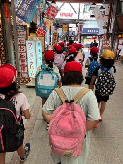 天神橋筋商店街も見学し、みんなの一番の楽しみはお弁当。嬉しそうに、美味しそうに食べていました。どこの学校よりも長い間公園で遊んだ後、くたくたで帰りました。