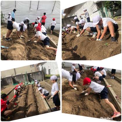 みんな一生懸命、スコップと手を使ってサツマイモを掘りました。何かの幼虫やミミズがたくさん出て、「きゃー!!」「わぁ〜!!」といいながら楽しそうに掘ることができました。また、サツマイモを傷つけないように周りから優しく掘っていました。結果は、豊作でした。子どもたちの顔よりも大きいものもあり、たくさん写真も撮りました。早く食べれるといいですね。