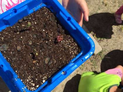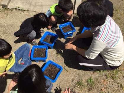 先週アサガオのたねをまいたプランターに水をやりにいってみると・・・なななんと、芽が出ていました!子どもによって出かたはそれぞれですが、順調な成長を見てみんなとてもうれしそうにしていました。「今日の帰りにはまた大きくなってるかなあ?」と興味津々で、明日からの水やりに気合が入っていました。
