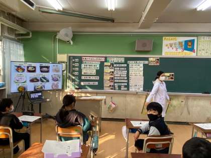 5年生2回目の栄養指導がありました。「和食のすばらしさを知ろう」をテーマに、毎日食べている給食を振り返りました。給食には和食だけではなく、洋食や中華さまざまなジャンルの料理が登場していることを、クイズ形式で楽しく学習しました。