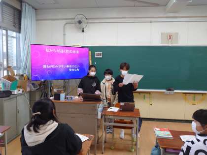 生江の町の未来の姿を想像し、その姿に近づくために、各市町村の取り組みを調べました。そして、町の事例を紹介しながら自分たちのグループの提案を発表しました。