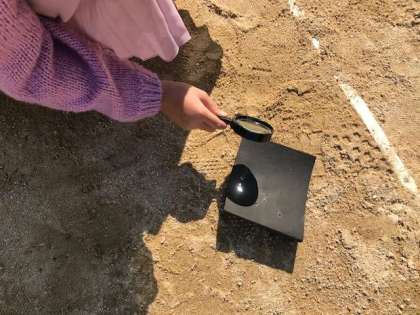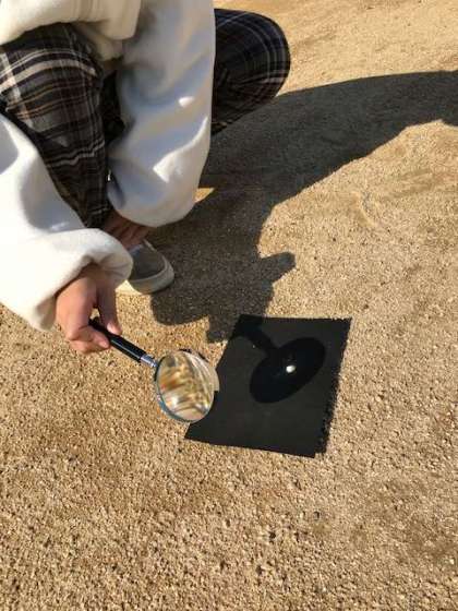 日光を虫眼鏡で1点に集めると、黒い画用紙に火が付き穴があきます。日光の力はすごい!