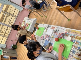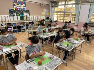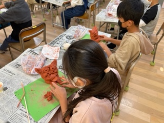 今日の図工では、粘土でシーサーを作りました。ひび割れができないように粘土を磨きながら思い思いのシーサーが出来上がりました。