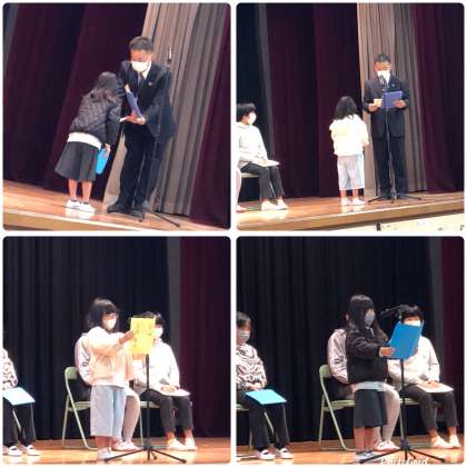 今日、全校朝会で作文発表がありました。2年生からは、2名が代表で発表をしました。題は、人権集会についてでした。トップバッターだったこともあり、2人ともとても緊張している様子でしたが、人権集会で、がんばったこと、心に残ったことなど自分たちの言葉で、堂々と発表することができていました。とてもかっこよかったです。今後もいろいろなことに挑戦していきましょう。