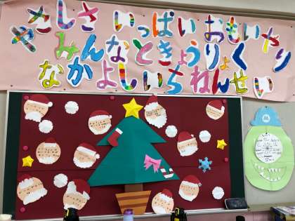 1年生の教室の掲示物が、クリスマス感でいっぱいになっています。