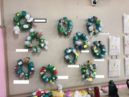 画用紙で作ったリースや一人一人の願い事が書かれたサンタクロースが張ってあります。子どもたち一人ひとりの個性が表現されていて、とてもかわいい作品になっています。ぜひ、今週からの学期末懇談会でご覧になってください。