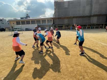 中学年は、ボールを取りに行く練習や1対1をしました。