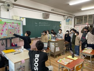今日の学習は、教室の名前を覚えようと日本と外国の学校を比べてみようです。教室の名前を覚えたあとは、ゲームにチャレンジ。ランダムに流れる音声から部屋を当てられるかな?友だちからのナイスヒントをもらいながら、なんと全員一回でクリアできました。
