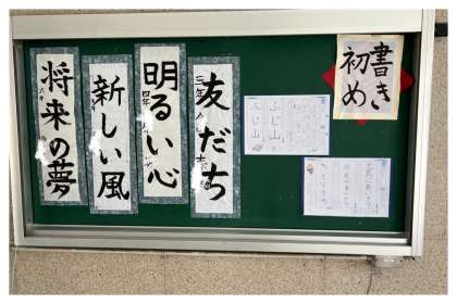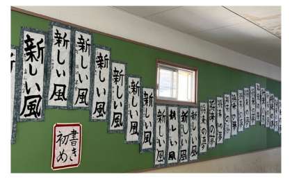 5年教室前の廊下にある長ーい掲示板には、5・6年生の書き初めが掲示されています。