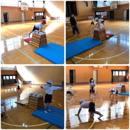 体育科で、跳び箱をしています。踏切・手のつき方・着地に意識して取り組んでいます。練習すればするほど、みんな上達していくのがわかります。跳べなかった子も跳べるようになり、「とべた〜。」といって喜んでいる姿も見られます。高さよりもきれいさを大事に跳び箱をしています。