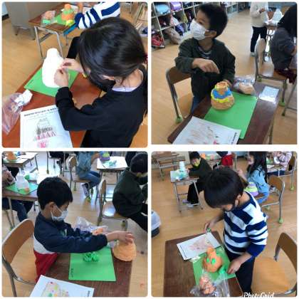 今日から、作品展に向けて、紙粘土をしています。すぐに乾いてしまうので、少し急ぎながら、常にこねながら子どもたちは楽しそうに紙粘土でケーキを作っていました。みんな工夫しながら、おいしそうなケーキを作っているので、作品展が3月に延期になりましたが、楽しみにしていてください。