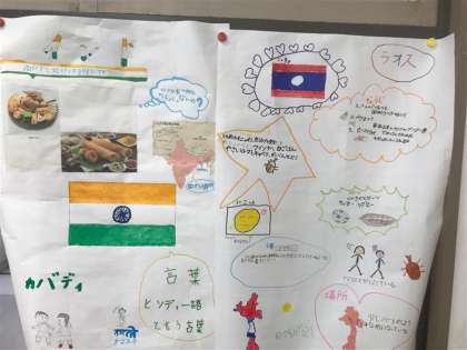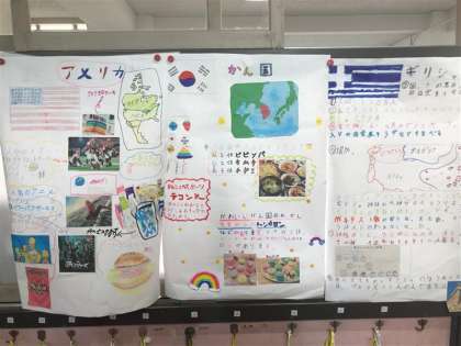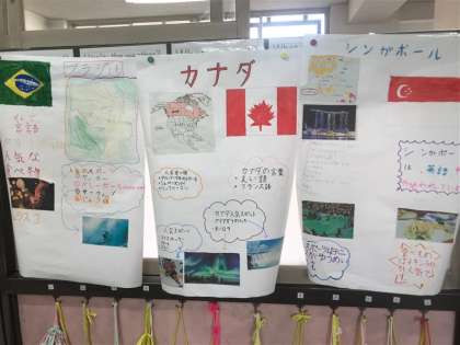 国語の学習で世界の国について調べたことを発表します。上手に調べてポスターにまとめることができました。