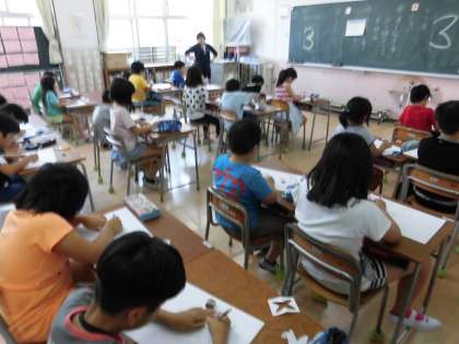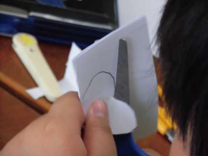 子どもたちは型を作るのに苦戦。画用紙を半分に折って「3」を書いて切るのですが、なかなか花のような形にならず何度も書き直して切っていました。