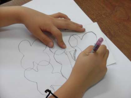 まずは、小さい画用紙に花の形の型を切って作り、画用紙に型に沿ってかきました。