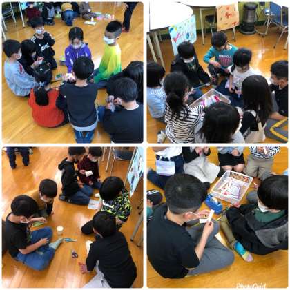 今日は、2年生が1年生を招待し、生活科で作ったおもちゃの作り方を教えて、一緒に遊びました。おもちゃは、「パッチンカエル」「紙トンボ」「紙コップロケット」の3種類でした。2年生は、優しく上手に教えていました。「上手に作れたね。」「すごーい。」と言った声掛けをしている姿を見ると、とてもお兄さん、お姉さんになったなと感じました。1年生も笑顔いっぱいで、楽しそうにしている様子でした。