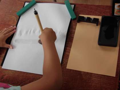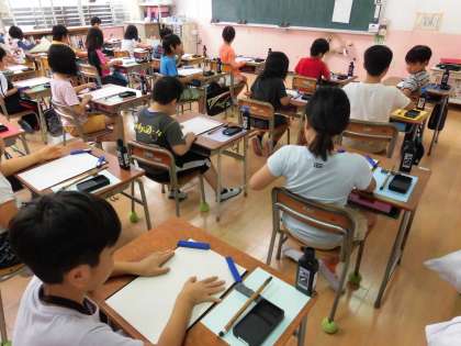 その後、書くときの姿勢や筆の持ち方などを学習して、次にお試しで水で更紙に「一」を書きました。初めての筆で「おもしろい!」という声も聞こえてきました。