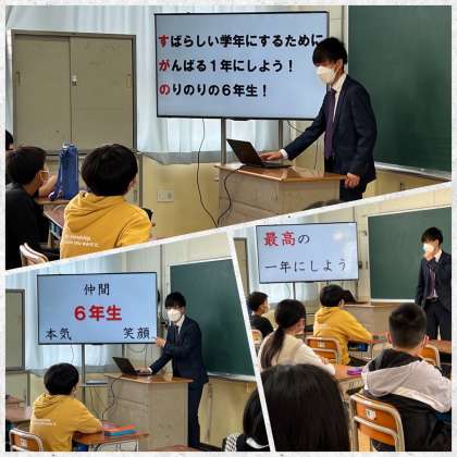 6年生では、「6年生になります」という自覚を持って、『仲間』『笑顔』『本気』の3本柱で『最高の一年にしよう!』という担任の熱い思いがヒシヒシと伝わる、とても素敵な話がありました。
