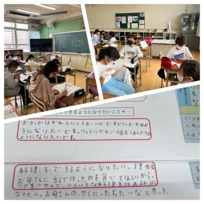 家庭科の学習を通して、できるようになりたいことを考え、交流しました。裁縫に関することや調理に関することなど、さまざまでしたが、『できるようになりたい!』という強い意欲が感じられ嬉しく思いました。