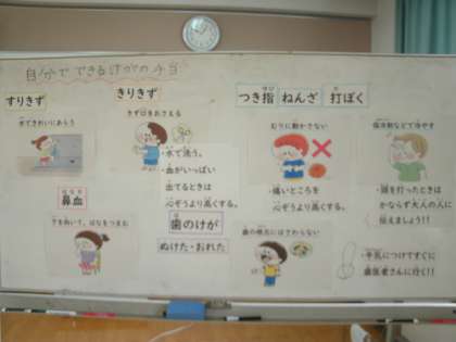 けがをしないように、教室やろうか・階段は歩く、はさみや彫刻刀などを使うときは気を付けるなど、日ごろから注意しましょう。けがをしてしまったときは、今日の手当てを思い出して、けがが早く治るようにしましょう。学校でけがをして手当てが必要な時は、保健室に教えてくださいね。