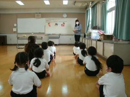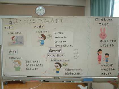 身長と体重をはかる前に1年生には「保健室の使い方・保健室の約束」、2年生には「保健室の約束、自分でできる手当て」について保健指導をしました。