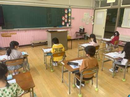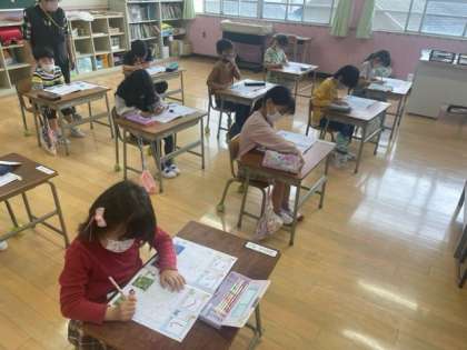ひらがなの学習がはじまりました。姿勢を正して、お手本をよく見て書いています。自分の名前の文字がでてくるととても嬉しそうです。とめるは「ピタッ」はらうは「シュッ」とても丁寧にかけました。