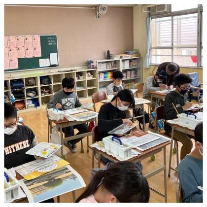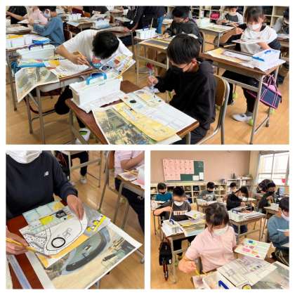 図画工作科では『わたしのお気に入りの場所』という題材で、学校のお気に入りの場所を描いています。