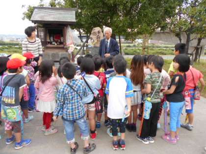 千人塚の碑の前では、戦争があったとき、ここでたくさんの人が亡くなられたこと、二度と戦争をしてはいけないというお話を聞き、真剣な表情で聞き入る子どもたち。