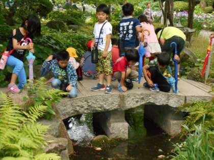 帰りに、菖蒲園にある池の中を覗いてみると、カエルやアメンボがいっぱい!