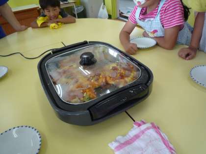 三時間目は親子ふれあい活動でした。協力して生地をこねたり、具をのせたりしてできあがり!子どもたちは「おいしい!」と言って食べていました。