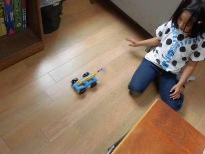子どもたちはみんな「強い風の方が遠くまで走る」と予想し、実験でそれが正しいことを証明できました。
