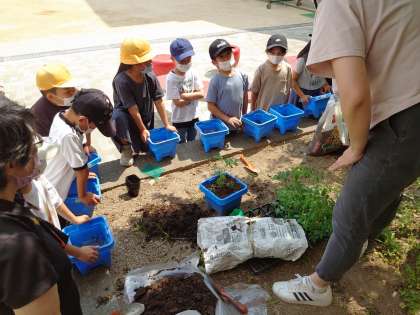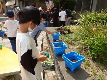 とても意欲的な2年生はすすんで土を植木鉢に入れて、用意をしていました。