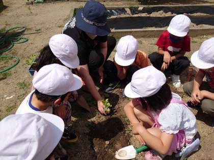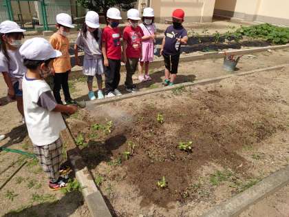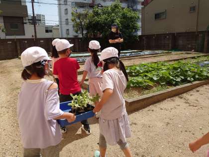 初めて行く学習園にワクワクしていました。スコップで土を掘り、植え替えをして水をたっぷりあげていました。