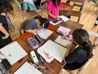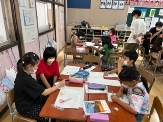 国語科の「みんなで新聞を作ろう」の学習で、各グループに分かれて新聞作りをしています。記事にしたい出来事を決め、それぞれの記事に必要な情報を集めます。インタビューをしたり、アンケートをとったりしながらグループで協力して作っています。出来上がりが楽しみです。
