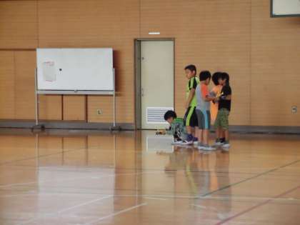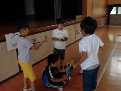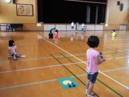 子どもたちはプロペラカーがお気に入りで、多くの子がプロペラカーで走らせていました。広い講堂で車を走らせるので子どもたちもとても楽しそうに活動していました。