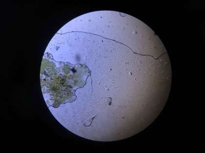 最初は、全然見つけることができず、子どもたちのテンションも下がり気味でした。ところが、次第にピントが合い、見つかるようになると、「うわー!」「気持ち悪い!」などの歓声が上がり始めました。子どもたちが見ていた顕微鏡の中を、スマホで撮ってみました。右の写真のような映像が見えます。