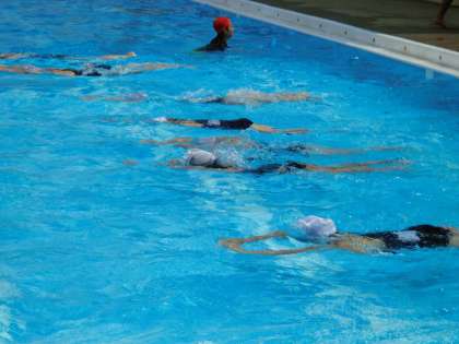 まずは、頭まで潜ったり、水中でジャンケンしたりする水慣れをしました。次に、プールを横向きに何度か泳がせて、泳ぐ感覚を思い出させました。