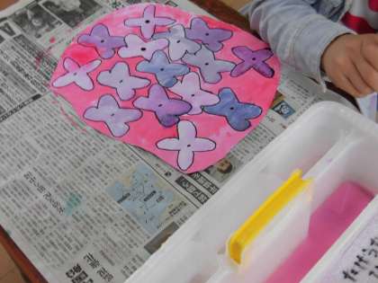 一枚は赤系、一枚は青系の色で塗りましたが子どもたちの丁寧な塗り方でとてもきれいなあじさいがたくさん出来上がりました!