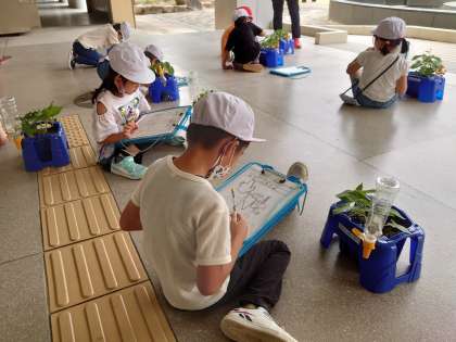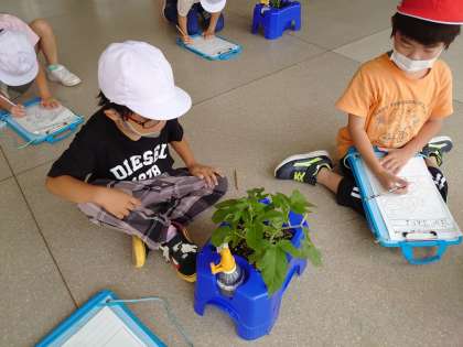 葉っぱがたくさん生えていることや葉がふさふさしていることを、見たり触れたりしながら記録していました。