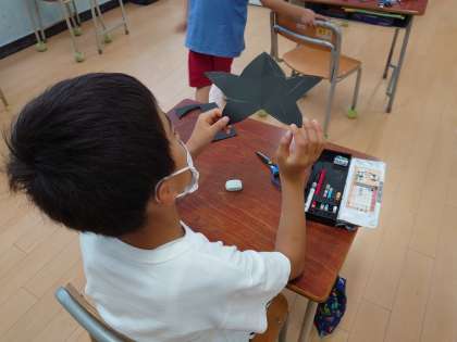 きれいな色や好きな色を選んで、飾り作りをしていました。ラミネートすると、花紙の色が重なって見えて、「きれいに作れた!」と喜んでできた作品を見せあっていました。