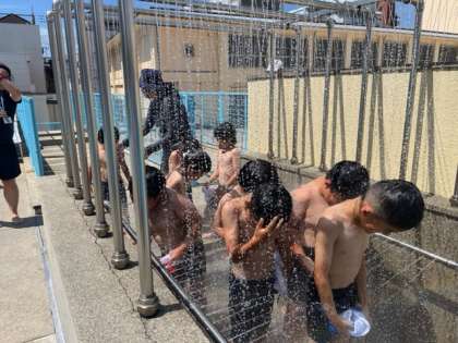 今日から1、2年も水泳の学習が始まりました。いいお天気で気持ちよく入ることができました。1年にとっては小学校に入学して初めてのプールです。水の中でダンスをしたり、走ったり、先生の合図をよく見て学習ができました。みんな笑顔いっぱいのプール開きになりました。